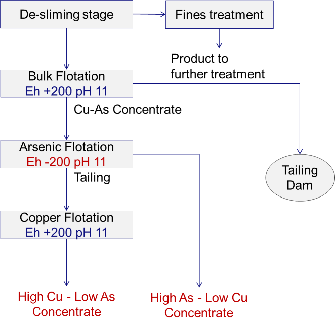 - A bulk copper-arsenic flotation stage at air set potential to produce a high arsenic-high copper concentrate.