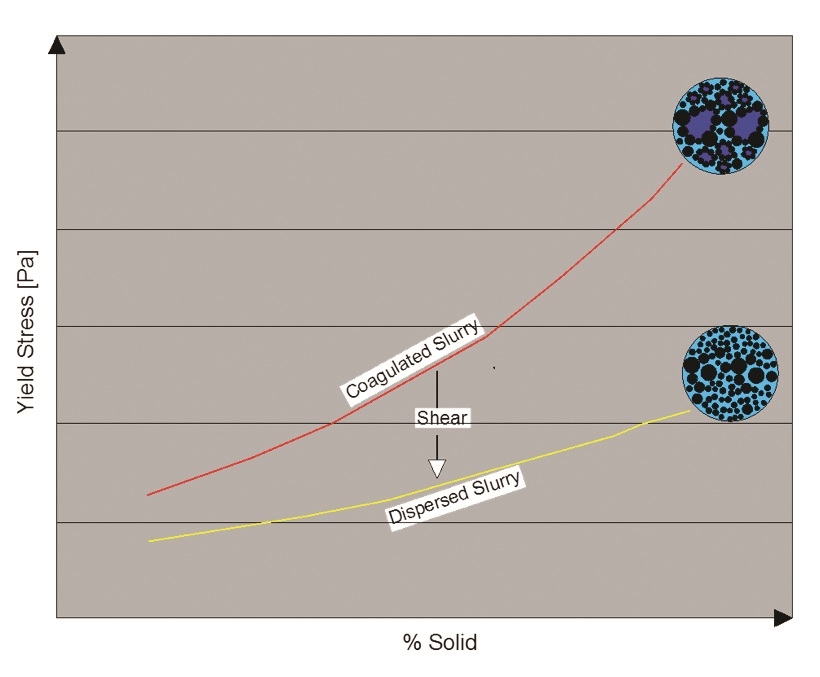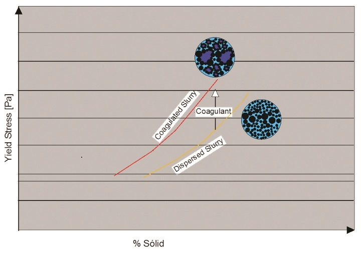 Dispersing reagents break down agglomeration of particles containing entrapped water, this water becomes part of the carrier by decreasing the flow stress, on the other hand, the coagulating reagents act to form new agglomeration of particles, imprisoning water and increasing the yield stress as shown in Figure 2.
